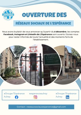 Ces réseaux sociaux seront également un excellent moyen de renforcer notre communication et de partager ensemble des moments importants de la vie scolaire et extra-scolaire.